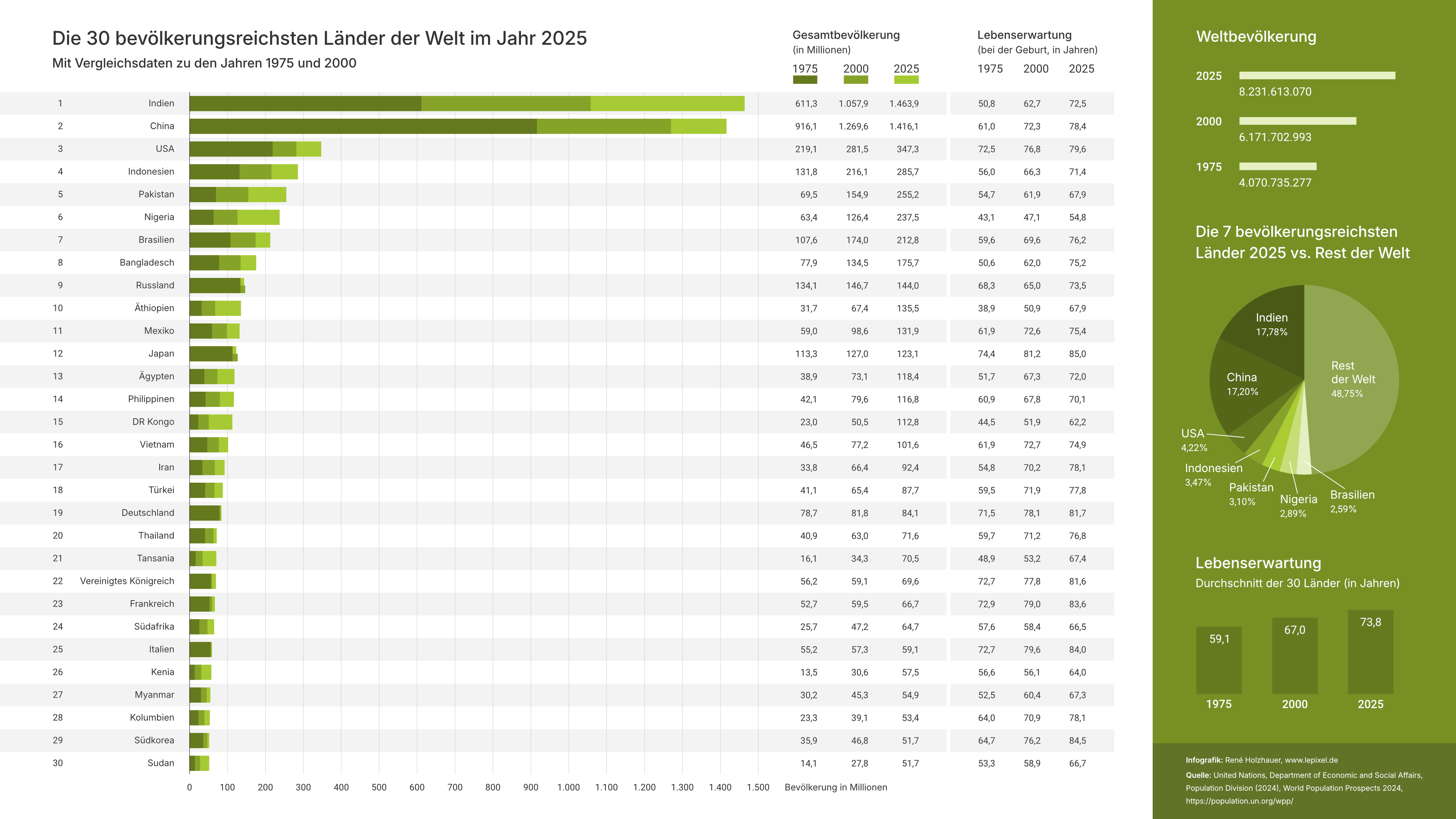 In dieser Infografik sind die 30 Länder mit der höchsten Einwohnerzahl im Jahr 2025 aufgelistet. Dazu kommen Vergleichsdaten zu den Jahren 1975 und 2000. Die Darstellung umfasst somit eine Zeitspanne von 50 Jahren. In dieser Zeit hat sich die Weltbevölkerung in etwa verdoppelt.